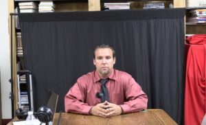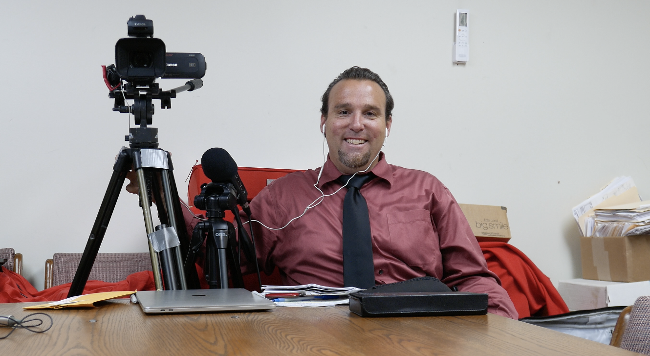 A witness sits in front of a black curtain backdrop for a recorded deposition.