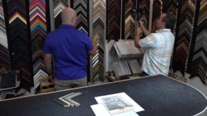 Field producer Matt DeSarle works with David Smith, the store owner of Old Main Frame Shop, to record color palettes in the store.