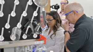 Videographer Matt DeSarle (seen in the background) captures footage inside of a science lab during a corporate documentary.